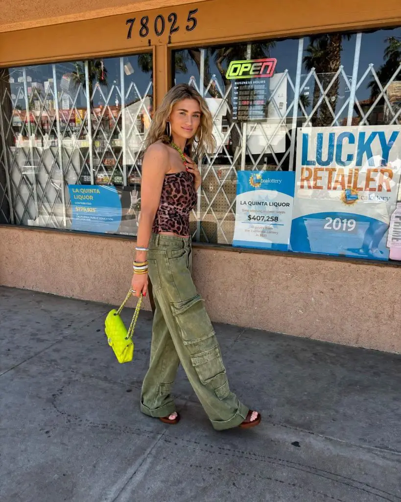 - Аксесуари: неонова зелена сумочка та кілька різнокольорових браслетів.