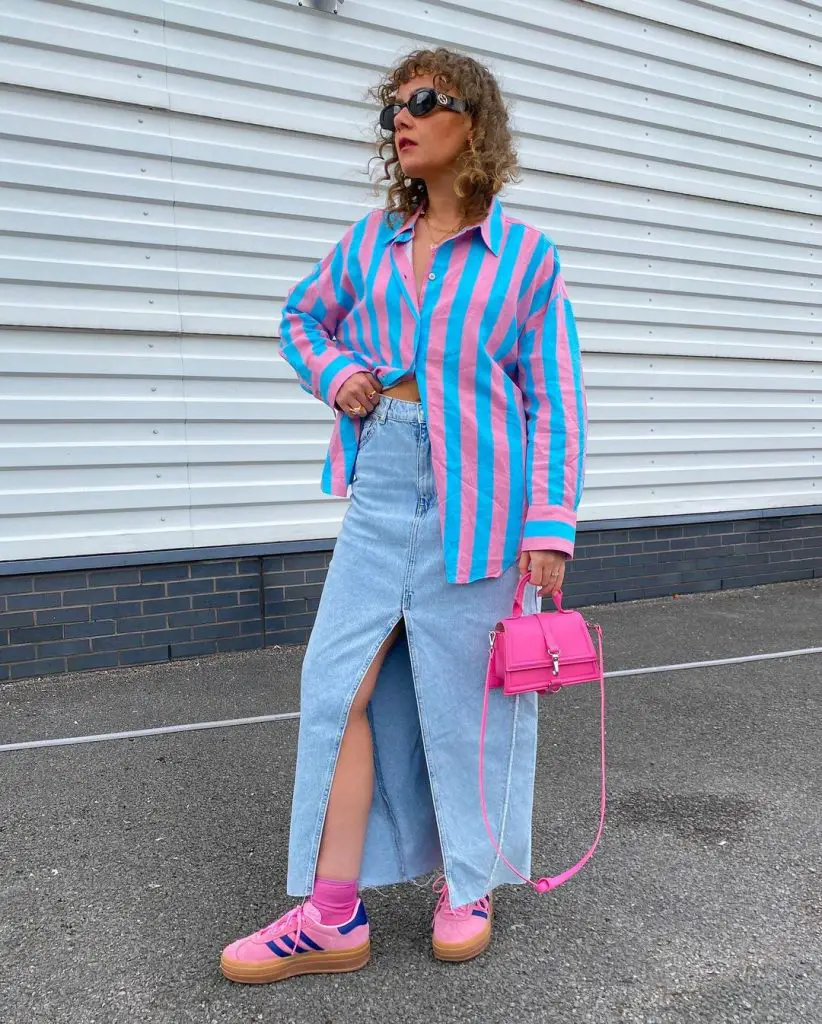 Опис: на сімнадцятій фотографії зображено ефектний, але зручний повсякденний одяг, який включає яскраву смугасту сорочку в поєднанні з джинсовою спідницею максі, що робить його ідеальним ансамблем як для прогулянок містом, так і для повсякденного офісу.