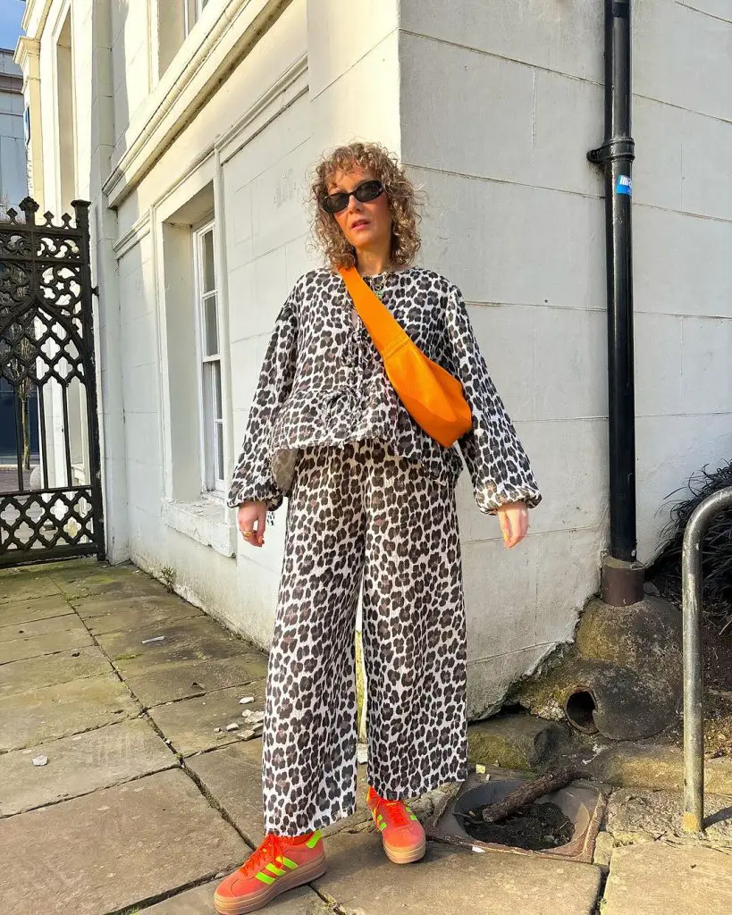- Аксесуари: сліпони з леопардовим принтом і маленька помаранчева сумка.