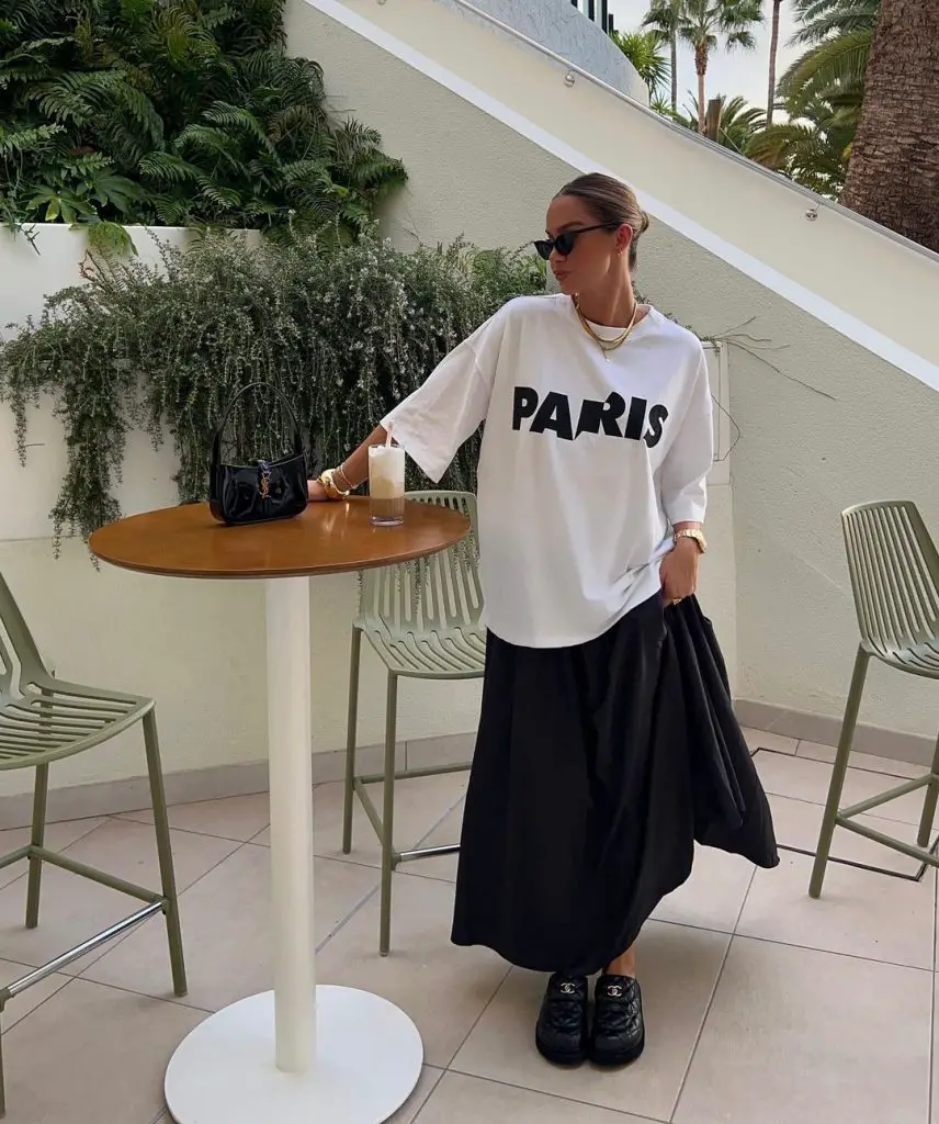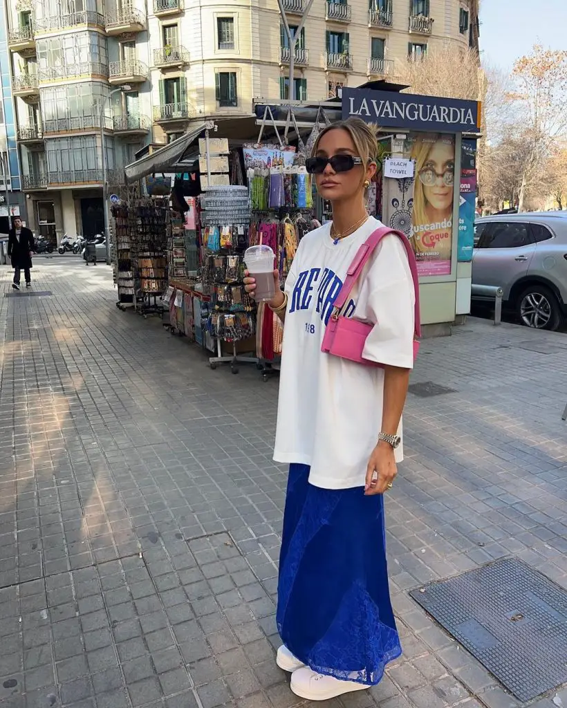 Опис: це вбрання про міський комфорт і стиль, що робить його ідеальним для розслабленого літнього вбрання в день подорожі містом. Поєднання вільної білої футболки та розпущеної синьої максі-спідниці створює баланс між повсякденністю та шиком.
