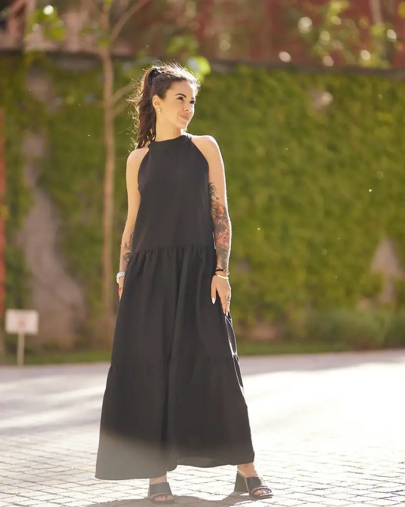 - Сукня: чорна максі без рукавів із високим горлом і розпущеним воланом на талії.