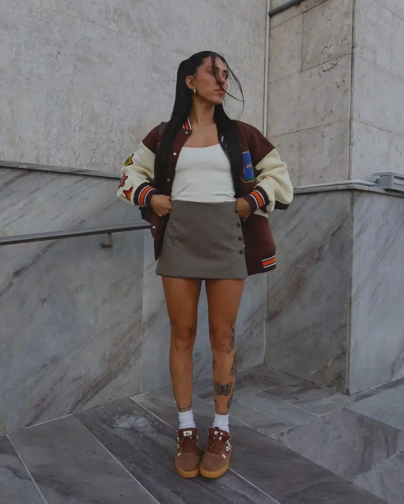 - Огляд стилю: університетська куртка додає відчуття молодості, бадьорості, тоді як спідниця зберігає жіночність і модність. Ця комбінація підходить для різноманітних повсякденних випадків, що робить її універсальним доповненням до будь-якого гардеробу.