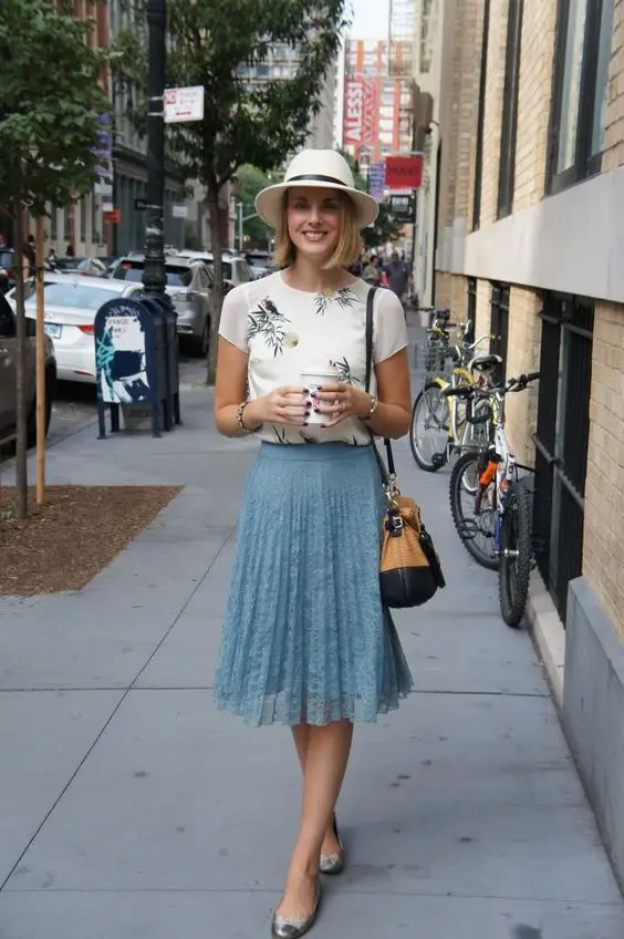 Для прогулянок вулицями міста необхідний ансамбль, який буде настільки ж модним, як і функціональним. Образ в образі передає суть міського літнього шику. Джинсова спідниця довжини міді А-силуету в поєднанні з білою футболкою, прикрашеною флорою, говорить про повсякденну елегантність. Це грайливий кивок на милий літній одяг для 30-річної жінки, яка знає, що місто – її справжня подіума.