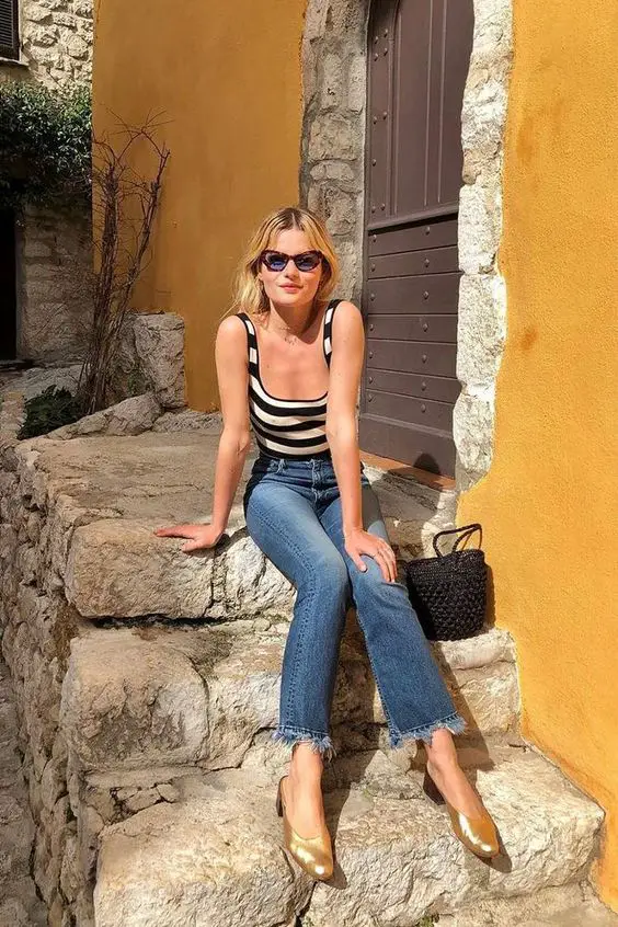 На цій картині, навпроти запеченої сонцем стіни, зображено вбрання, настільки ж просте, як і вражаюче. Боді-майка в смужку в поєднанні з класичним укороченим денімом є прикладом милого літнього вбрання для 30-річної жінки, яка насолоджується поєднанням прибережного шарму та міської витонченості.