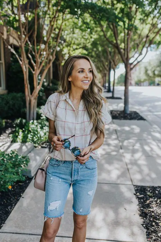Цей одяг випромінює невимушений шарм, ідеальний для сонячного дня в передмісті або спокійного сніданку з друзями. Легка картата сорочка та шорти з потертого деніму — це літнє вбрання, яке жінки старше 30 знайдуть грайливим і практичним.