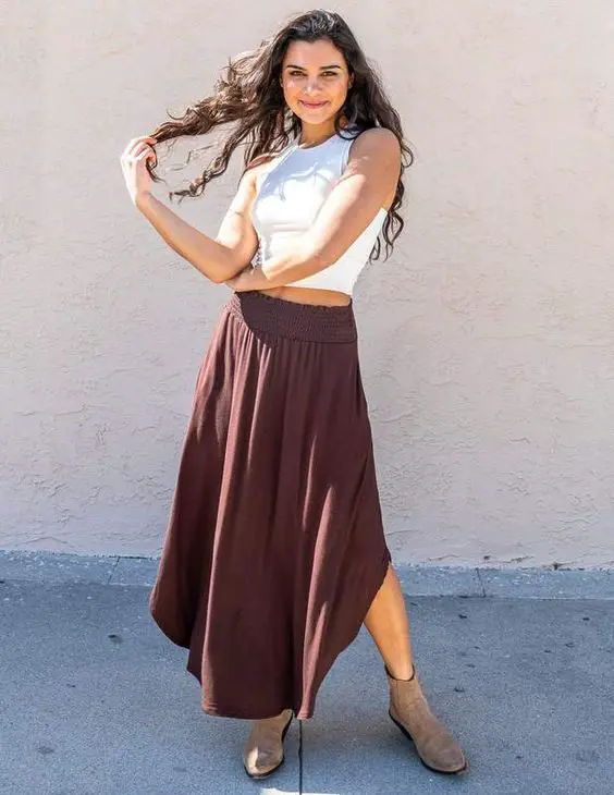 Вбрання в образі – це ковток свіжого повітря, поєднуючи облягаючий білий кроп-топ з летючою темно-бордовою спідницею. Він забезпечує чудовий баланс між приталеними та вільними формами — ідеально підходить для літнього вбрання для жінок старше 30 років, які насолоджуються танцем легких тканин і структурованих топів.