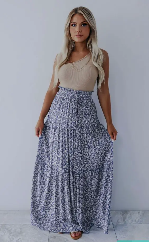 - Квіткова максі-спідниця: принт на спідниці є натяком на літні сади, що течуть у синьому морі.