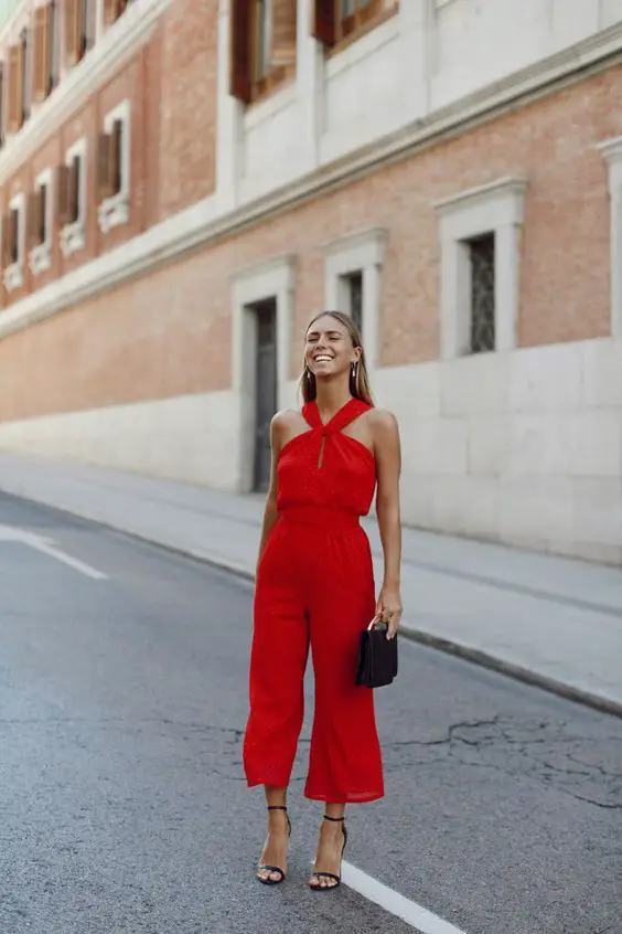 Цей образ випромінює сміливість, демонструючи червоний комбінезон, який є водночас ефектним предметом і підкреслює силует. Це літнє вбрання жінок старше 30 років, які не соромляться робити шикарний фурор.