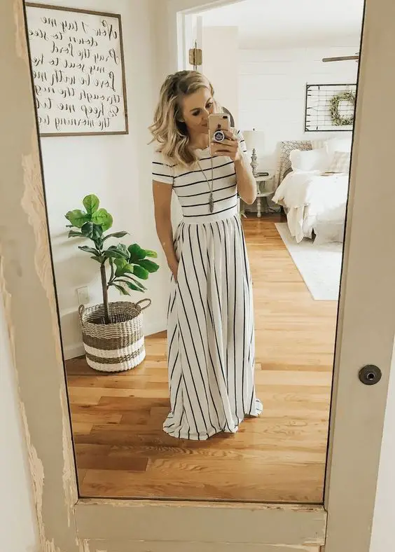На цьому зображенні сукня в морському стилі, присвячена розслабленим літнім дням. Класичні смужки та плавний максі-крій роблять його типовим вибором для милих літніх нарядів для 30-річної жінки.