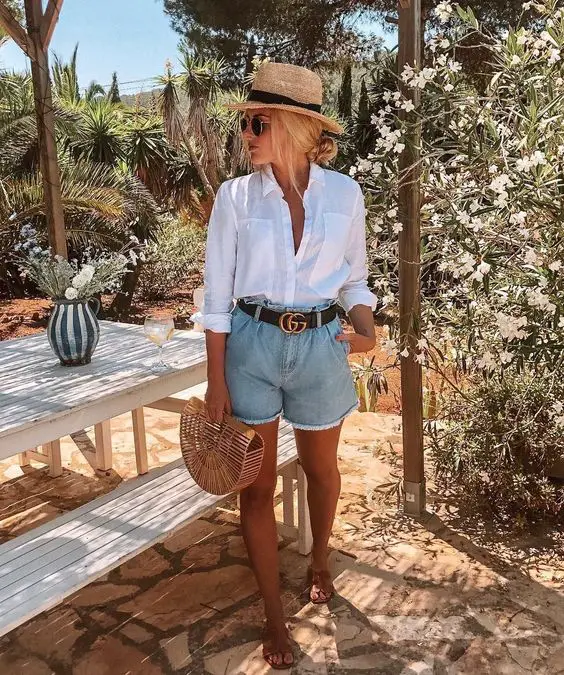 Цей ансамбль ідеально підходить для тих літніх вечорів, де золота година триває весь вечір. Яскравий білий ґудзик із зав’язкою на талії в поєднанні зі світлими джинсовими шортами ілюструє милий літній наряд для 30-річної жінки. Він невимушений, але вишуканий, ідеально підходить для барбекю на задньому дворі або вечірки під час заходу сонця.