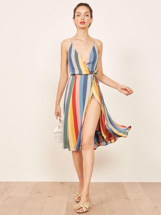 Вихор кольорів проливається крізь цю вражаючу смугасту сукню, ілюструючи грайливий, але врівноважений характер літнього вбрання для жінок старше 30 років. Дизайн обгортки підкреслює силует, що обтягує талію, і додає нотку драматизму завдяки високому розрізу.