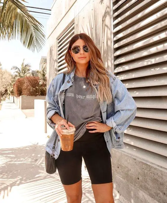 Зображений на міському тлі, образ грає з шарами та текстурами, показуючи футболку з графічним малюнком під вільною джинсовою курткою та чорними байкерськими шортами — відображення літнього вбрання для жінок старше 30 років, які відстоюють повсякденну прохолоду з відтінком гостроти.
