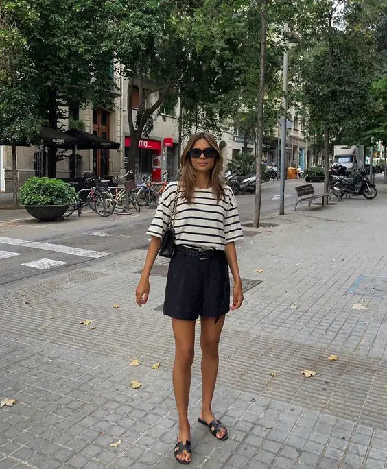 Подивіться на невимушений шарм вигляду «Я щойно це одягнув», який насправді вимагав ретельного планування. Поєднання смугастої футболки, заправленої в чорні шорти з високою талією, створює літній одяг для 30-річної жінки, який буде водночас стильним і приземленим. Незалежно від того, чи то швидка прогулянка за продуктами, чи випадкове побачення на каві, цей одяг готовий до цього.