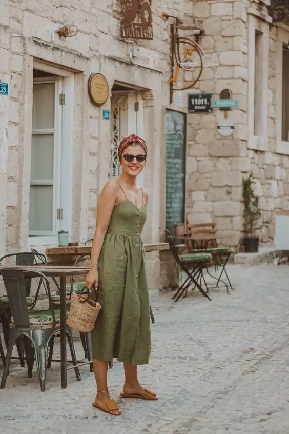 Охоплюючи жвавість середземноморського узбережжя, представлений тут одяг є виразом стриманої розкоші. Оливково-зелена сукня довжини довжини з вишуканою талією ідеально підходить для жінок, які люблять літнє вбрання для жінок старше 30 років із легкою витонченістю.