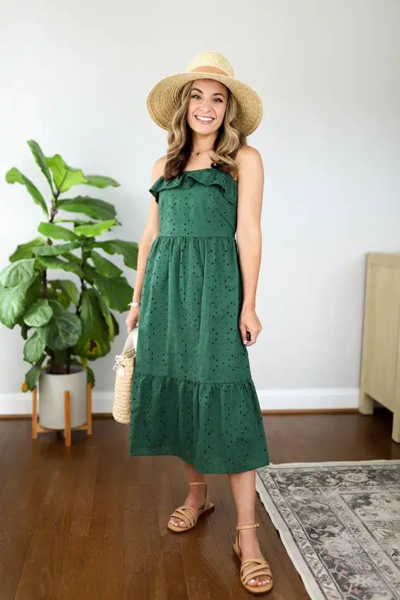 Зелене плаття з воланами, прикрашене витонченими люверсами, передає суть вечірки в саду. Це свіжий погляд на милий літній одяг для 30-річної жінки, який обіцяє комфорт і елегантність.