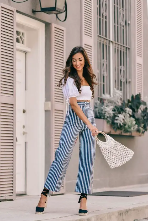 Ритм міста відтворюється в смужках цих кюлотів у поєднанні з чітким білим кроп-топом. Це ідеальне літнє вбрання для 30-річної жінки, яка з апломбом поєднує кар’єру та гру.