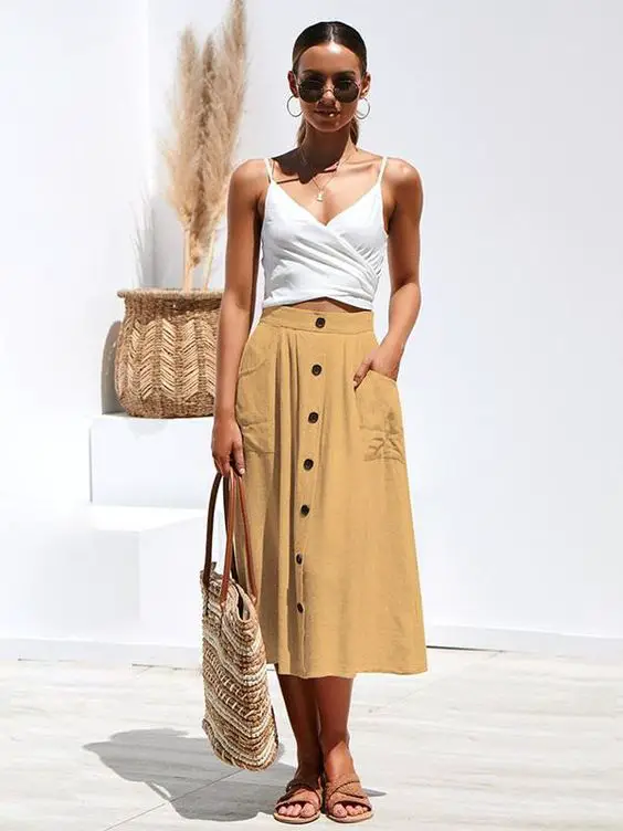 Уявіть собі сонячну післяобідню вечірку, і цей ансамбль бездоганно впишеться в нього. Кручений білий топ чудово поєднується з гірчичною спідницею на ґудзиках. Це урок літнього вбрання для жінок старше 30 років — витонченого, але сповненого молодості.