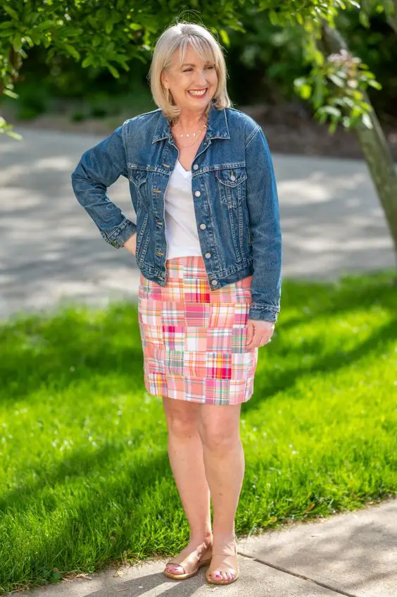 Для тих літніх днів, коли потрібні пікніки в парку або випадкові зустрічі на задньому дворі, ця класична джинсова куртка поверх спідниці в клітку забезпечує ідеальне поєднання комфорту та повсякденного шику. Це вбрання є чудовим нахилом до літнього вбрання для жінок старше 50 років, які цінують непідвладний часу стиль у своєму гардеробі.