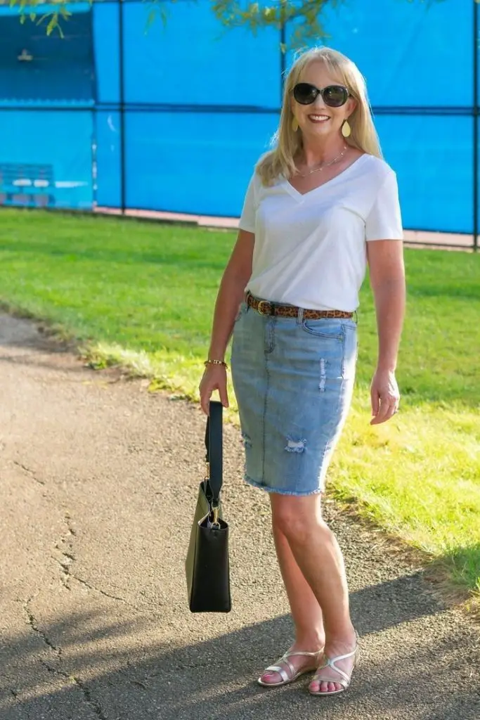 Простота — головна нота справжньої елегантності, особливо влітку. Цей ансамбль із класичною білою футболкою з V-подібним вирізом і джинсовою спідницею довжиною до коліна є квінтесенцією літнього вбрання для жінок старше 50 років. Це поєднання комфорту та невимушеної витонченості, ідеальне для сніданку у вихідні або дня в тенісному клубі. .