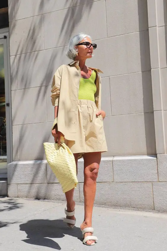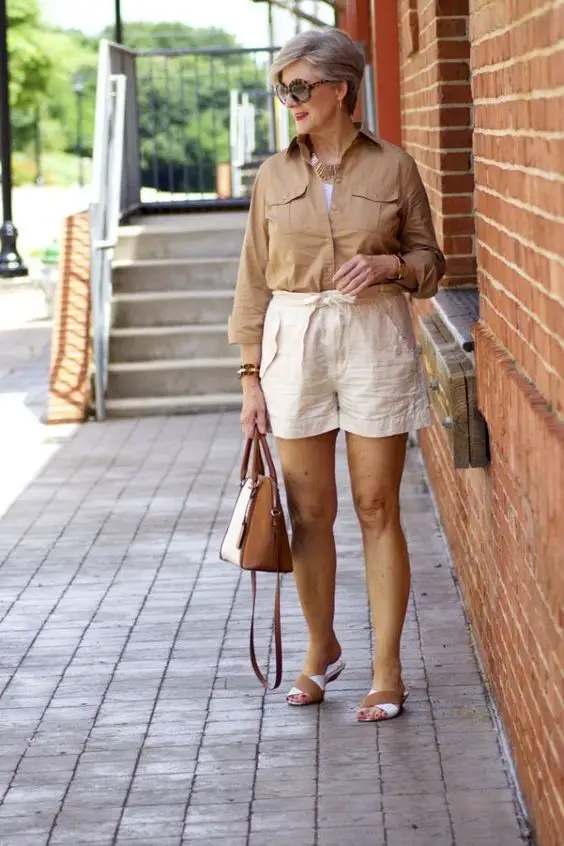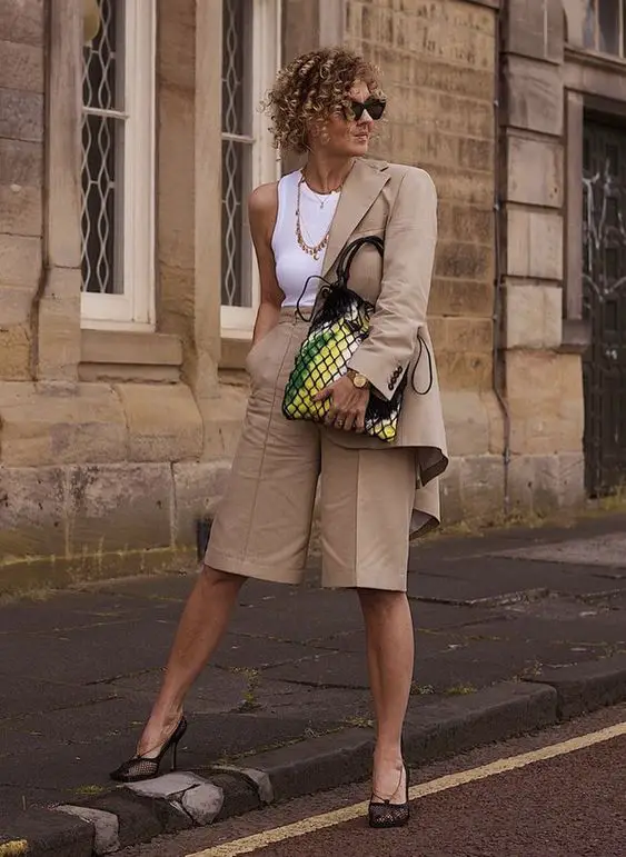Літо в місті вимагає одягу, який буде одночасно стильним і адаптованим до спеки, як-от цей ансамбль нейтральних тонів. Цей образ служить універсальним фоном для різноманітних аксесуарів, що робить його типовою частиною літнього гардеробу для жінок старше 50 років. Поєднання легкої куртки та шортів створює поєднання вишуканості та легкості – ідеально підходить для міського сафарі чи шикарного післяобіднього сніданку.