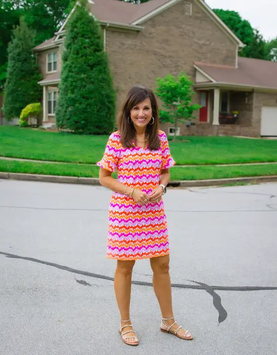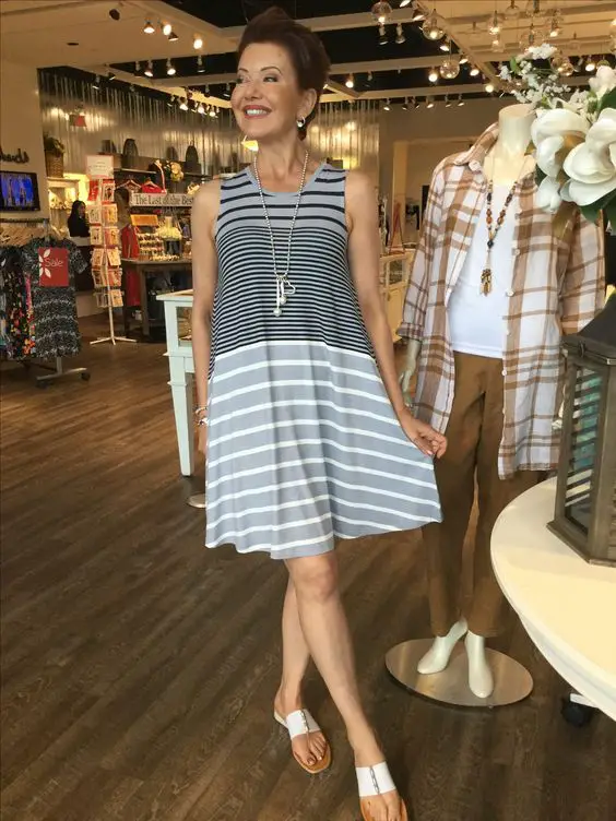 Ніщо так не говорить про літо, як смужки, і ця струмлива смугаста сукня вражає всі нотки милого літнього вбрання для жінок старше 50. Крій без рукавів забезпечує рух і легкість, а м’яке погойдування спідниці А-силуету підкреслює кожен крок. . Ідеально підходить для книжкового магазину чи відвідування художньої галереї, це свідчення того, що літнє вбрання для жінок старше 50 років у 2025 році може бути одночасно модним і позачасовим.