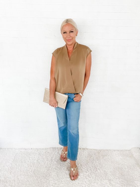 У розпал літа менш часто краще, і ця шикарна блуза без рукавів і спокійне поєднання деніму втілює сучасний мінімалізм для літнього вбрання для жінок старше 50 років. Це ідеальне поєднання для відкриття галереї чи вишуканого вечірнього заходу.