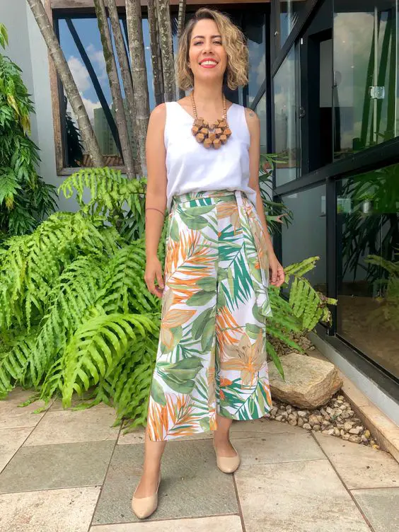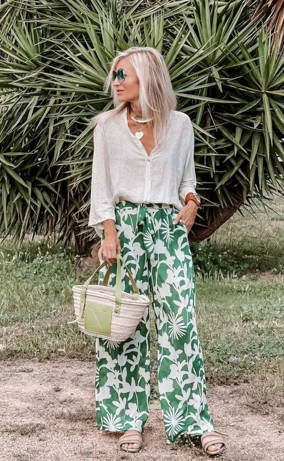 Літо є синонімом яскравих принтів і струмуючих тканин, і ці штани з тропічним принтом у поєднанні з яскравою білою майкою демонструють ідею літнього вбрання для жінок старше 50 років, яке є водночас елегантним та енергійним. Ідеальний варіант для курортного відпочинку або шикарного бранчу.