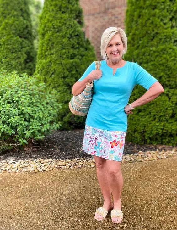 У дні, коли комфорт є ключовим, цей яскраво-блакитний топ із грайливою спідницею з принтом стане чарівним повсякденним літнім нарядом для жінок старше 50. Він ідеально підходить для неспішної прогулянки парком або неформальної вечірки в саду.