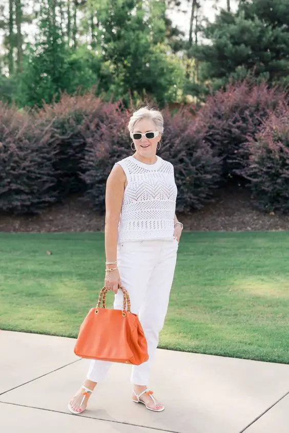 Цей ансамбль білого на білому з фактурним верхом є втіленням літньої витонченості, ідеально підходить для літнього вбрання для жінок старше 50 років, які цінують чисті лінії та монохромну палітру.