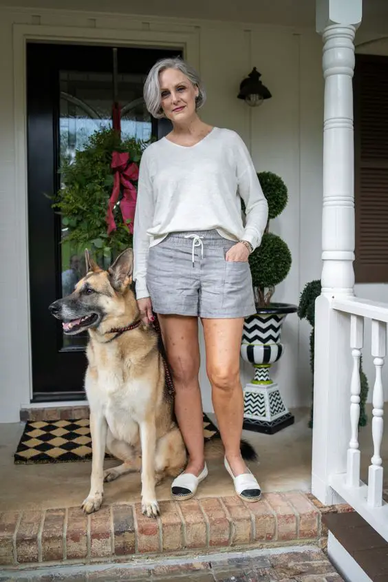 Літо – це не просто сезон; це стан душі. Для жінки, яка любить поєднувати повсякденний комфорт із витонченим стилем, цей ансамбль у сіру смужку є свідченням ідей літнього вбрання для жінок старше 50 років. Спокійне поєднання светра та шортів ідеально підходить для вечірніх розваг із вашим чотирилапим. друга або випадкової кави з друзями. Це втілення повсякденного літнього вбрання для жінок старше 50 років, де практичність поєднується з вишуканістю.