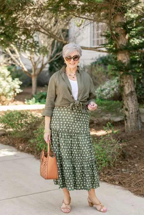 Прийміть нотку богеми з цим багатошаровим оливково-зеленим жакетом поверх спідниці в крапки, стильним вибором для літнього вбрання жінок старше 50 років. Цей ансамбль досить універсальний для дня шопінгу чи невимушеної вечірньої вечері.