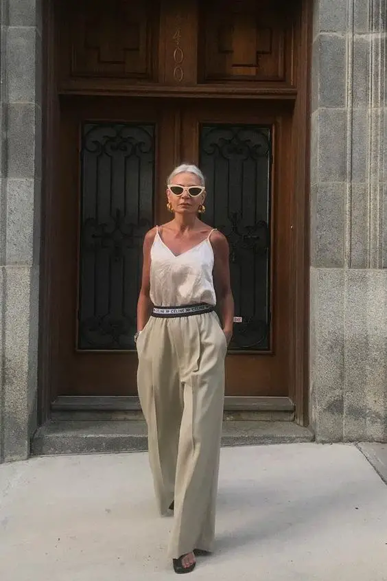 Ніщо так не говорить про міський шик, як пара широких брюк з широкими штанинами та ніжного шовкового камзола. Це вбрання — урок вишуканості, ідеально підходить для стильної жінки за 50, яка шукає літнє вбрання, яке плавно переходить від дня до ночі.
