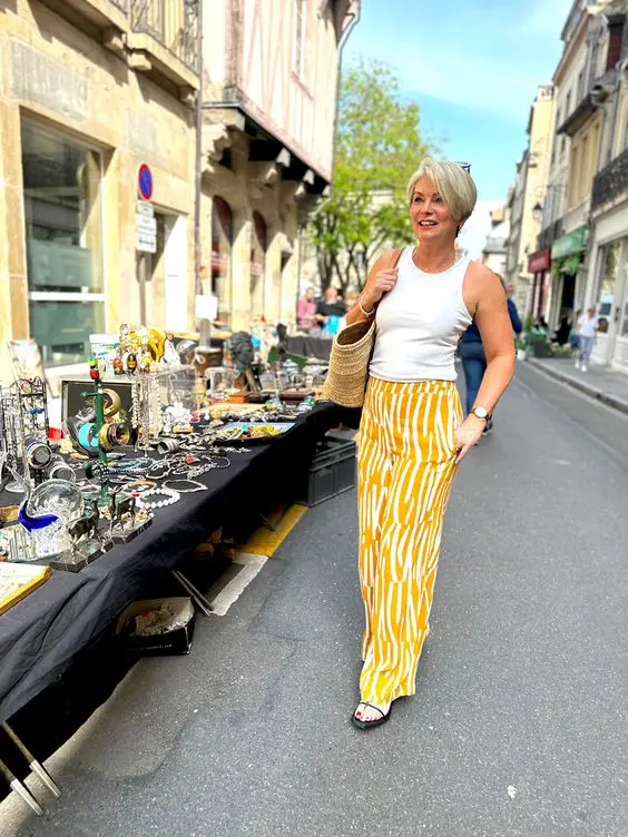 Коли ви блукаєте місцевим ринком, нехай ваш одяг говорить про ваш радісний настрій у цій комбінації палаццо в жовту смужку та білої майки. Цей життєрадісний ансамбль — яскравий приклад літніх образів для жінок за 50, які хочуть виділятися на сонці впевнено та витончено.