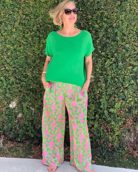 Літо — пора яскравих кольорів і сміливих візерунків, і цей наряд — яскравий приклад літніх ідей для жінок старше 50. Яскраво-зелений топ у поєднанні з рожевими брюками в квіточку створює ансамбль, який привертає увагу та відповідає віку. Цей образ ідеально підходить для вечірки в саду чи яскравого зібрання, втілюючи суть літнього вбрання, яке жінки старше 50 років можуть носити, щоб зробити яскраву заяву.