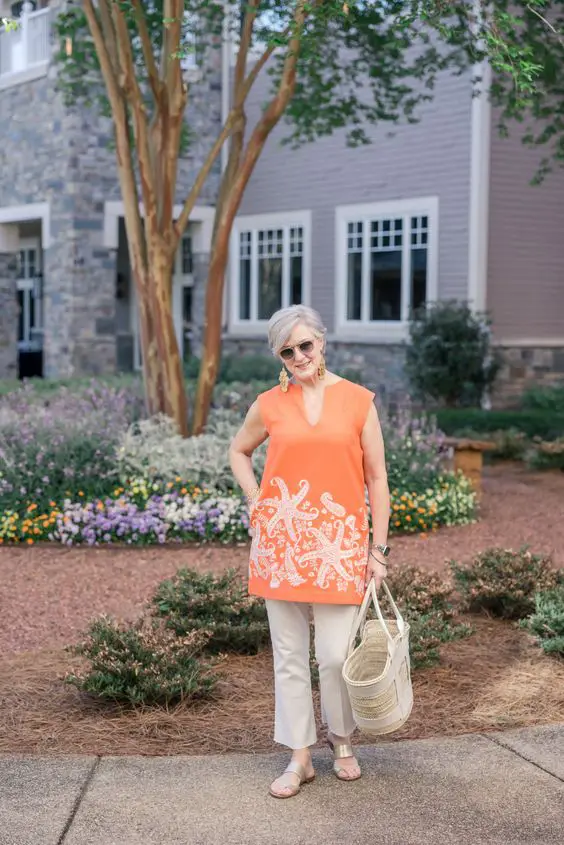 Коли спека зростає, зростає й можливість одягнути щось настільки ж яскраве, як і ошатне. Ця помаранчева туніка зі складною білою вишивкою є фантастичним вибором для повсякденного літнього вбрання для жінок старше 50 років. Вона простора, але не надто велика, а вишивка додає нотку вишуканості, ідеально підходить для відпочинку на курорті чи шикарної прогулянки околицями.