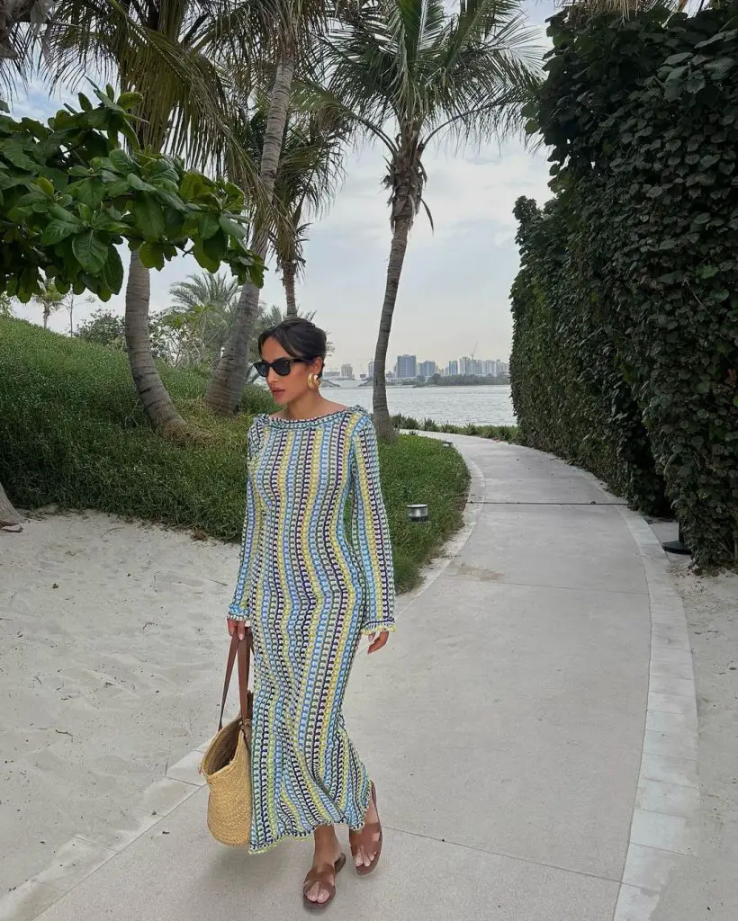 - Максі-сукня з фактурою: м’який силует, зручний і стильний, є ключовим елементом літнього пляжного одягу для жінок.