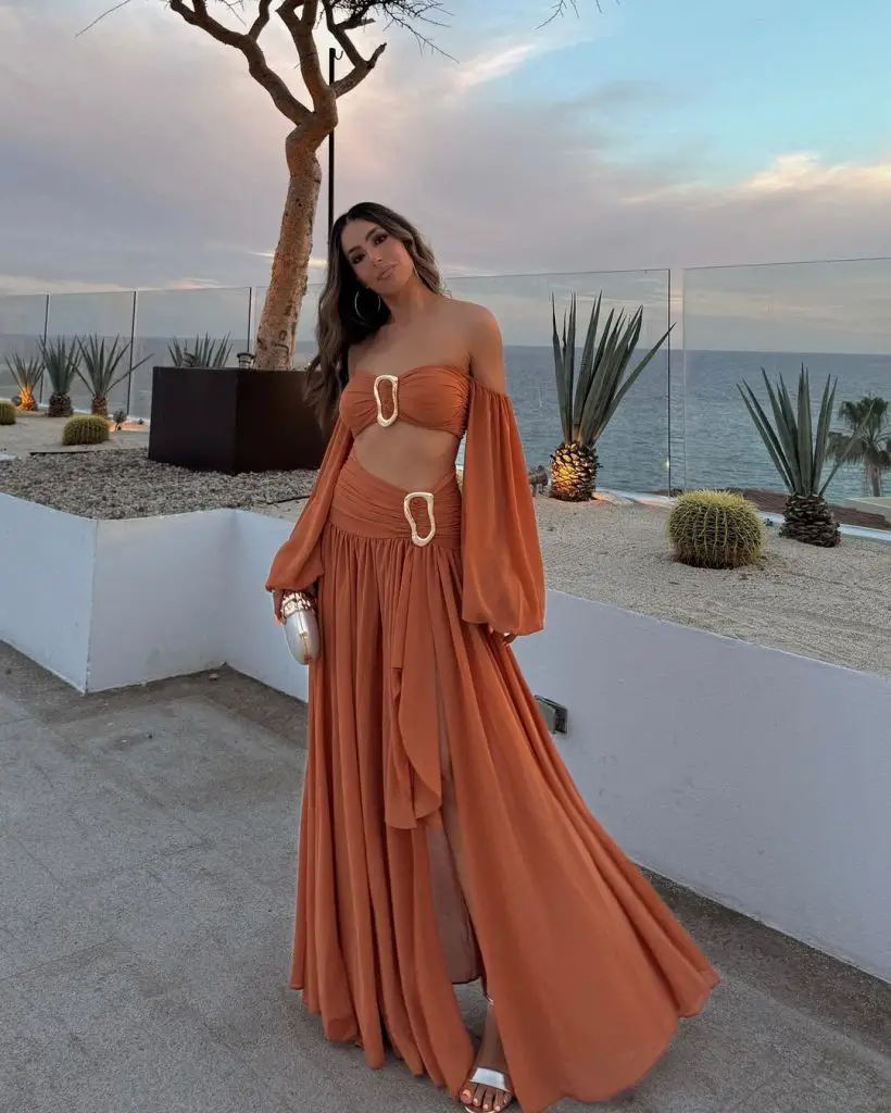 - Дизайн сукні: максі-сукня з розрізом поєднує в собі привабливість і свободу рухів, це скарб серед ідей літнього пляжного одягу.