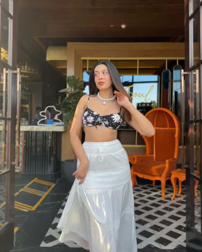 - Дует укорочуваного топа та спідниці: укорочений білий топ є свіжим контрастом до темно-синього кольору спідниці з запахом, нагадуючи літній пляжний одяг для жінок.