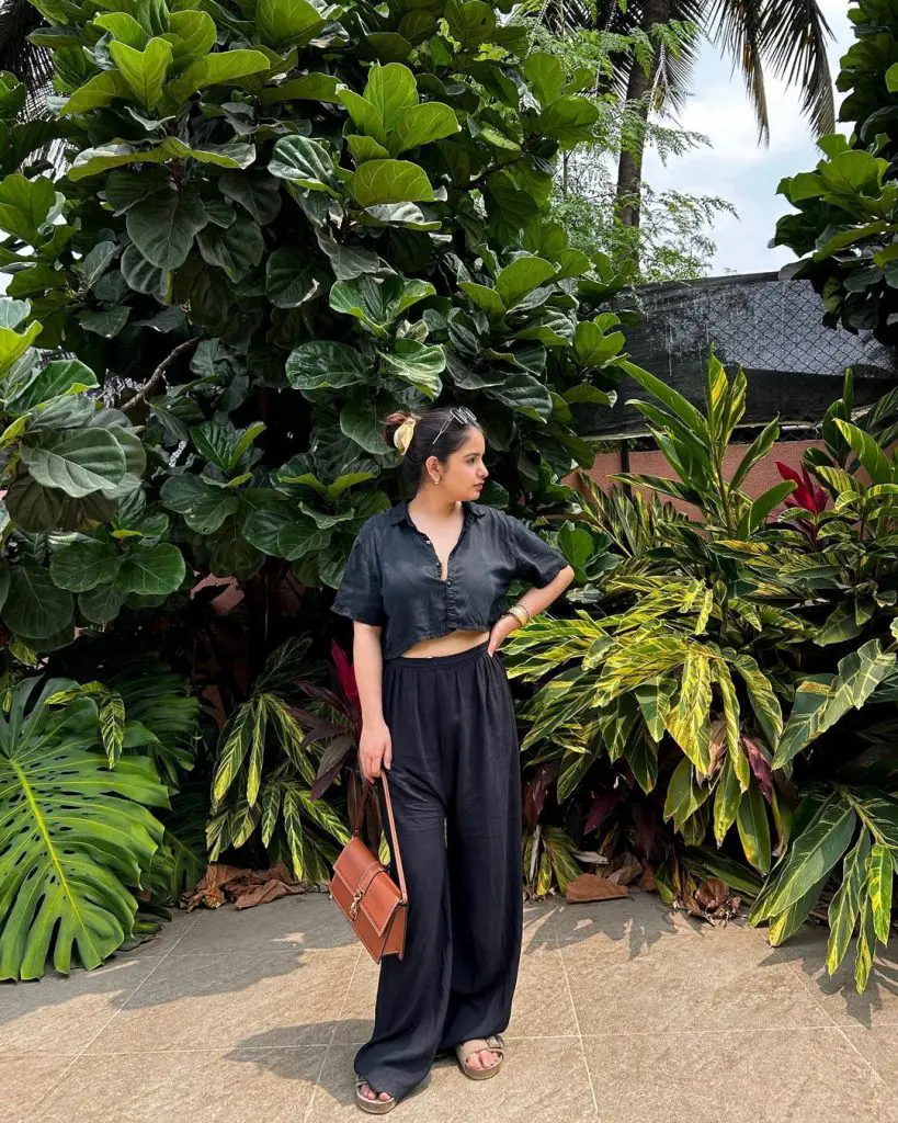 - Гармонійний баланс: темний кроп-топ чудово поєднується з брюками-палаццо з високою талією.