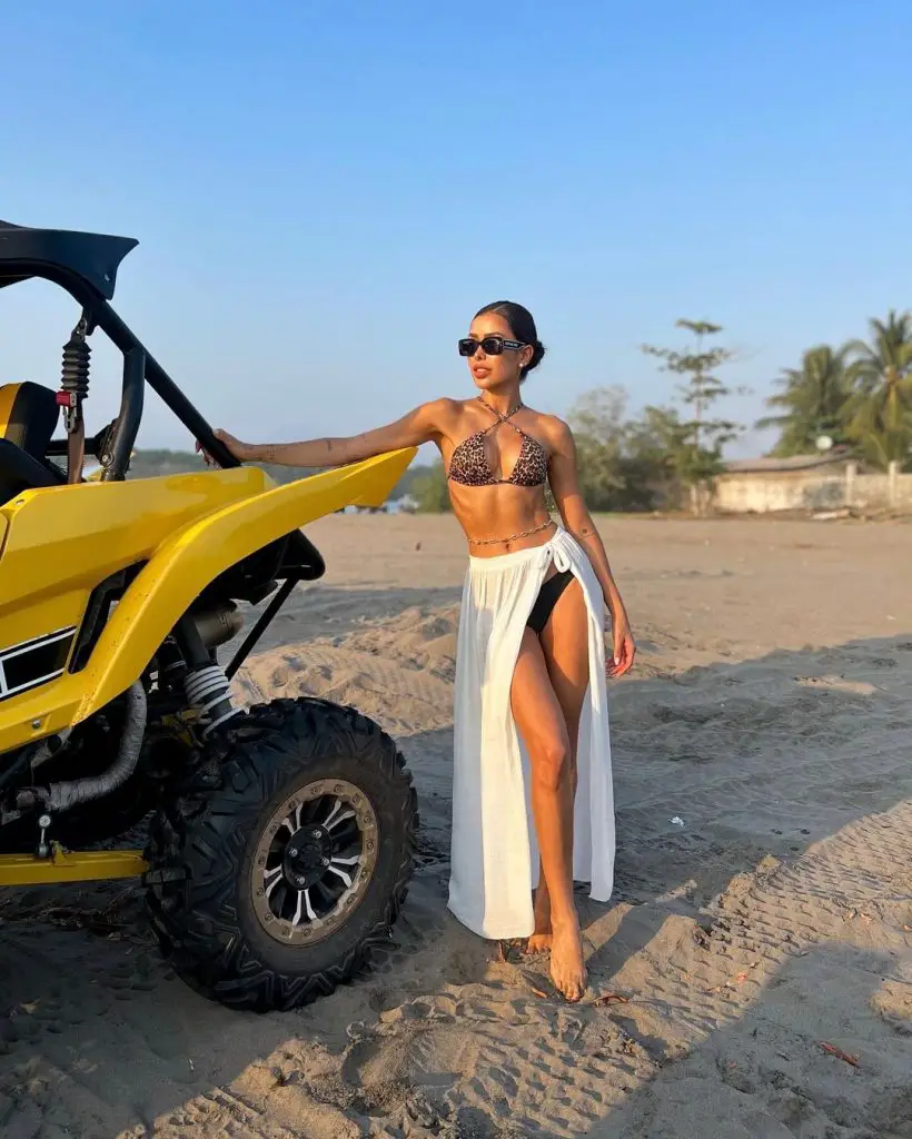 Цей образ є свідченням зухвалого духу літа, де мода зустрічається з пригодами на піщаних берегах.