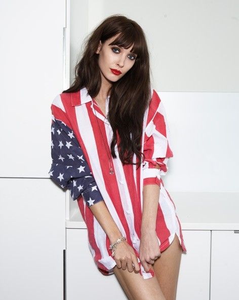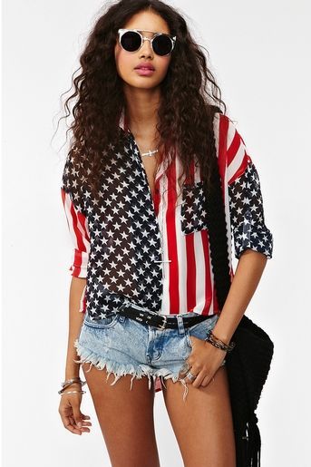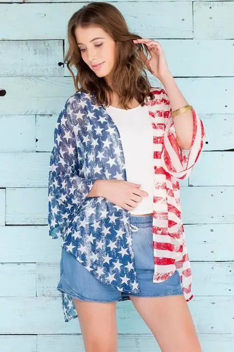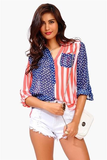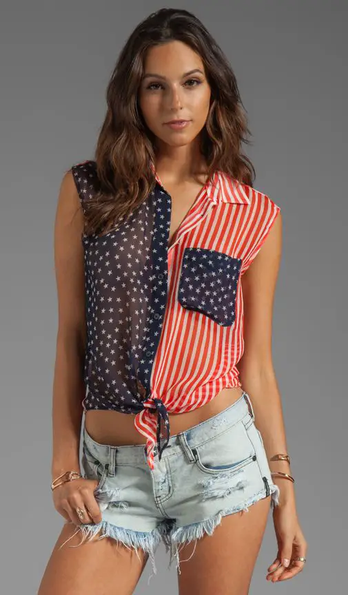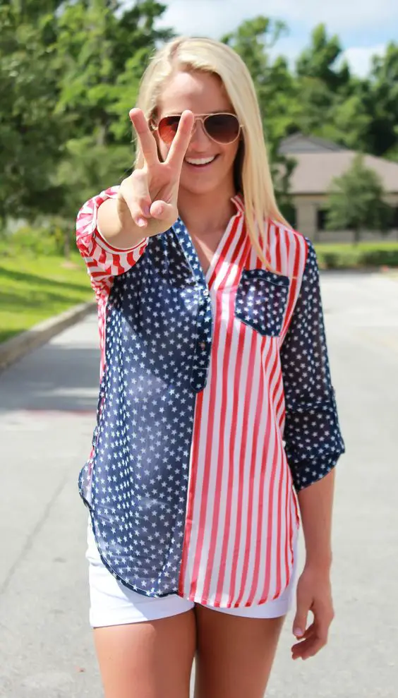 Тут ми бачимо більш молодіжний підхід із напівпрозорою сорочкою 4 липня, яка поєднує дизайн американського прапора з сучасним кроєм блузи. Поєднання зірочок і смуг пропонує грайливий, але шанобливий кивок на прапор.
