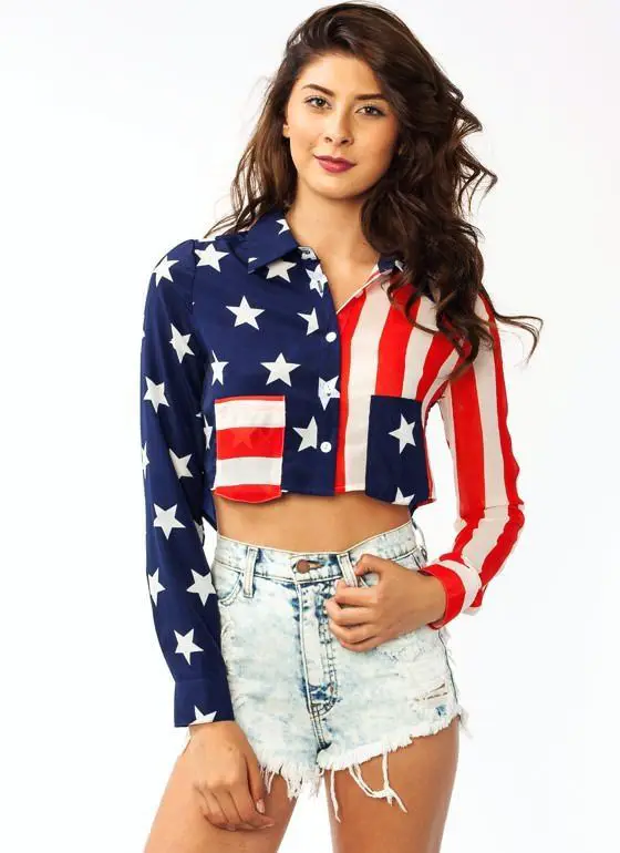 На зображенні зображена молода жінка в укороченій сорочці 4 липня, яка вміло поєднує зірки та смуги американського прапора в сучасному, гострому дизайні. Сорочка пошита, щоб відобразити енергію молодості та сміливий модний образ.