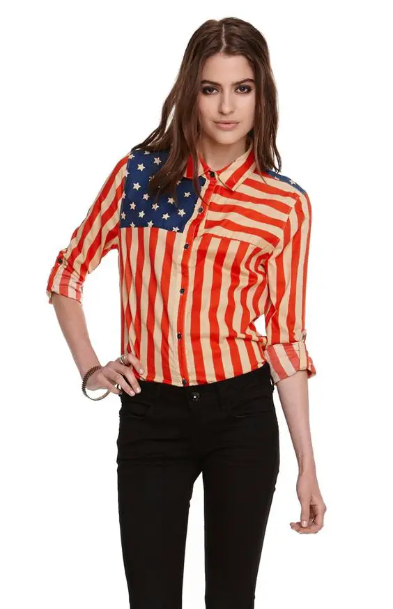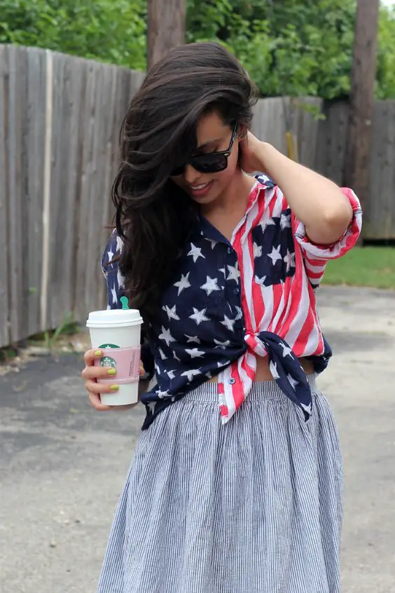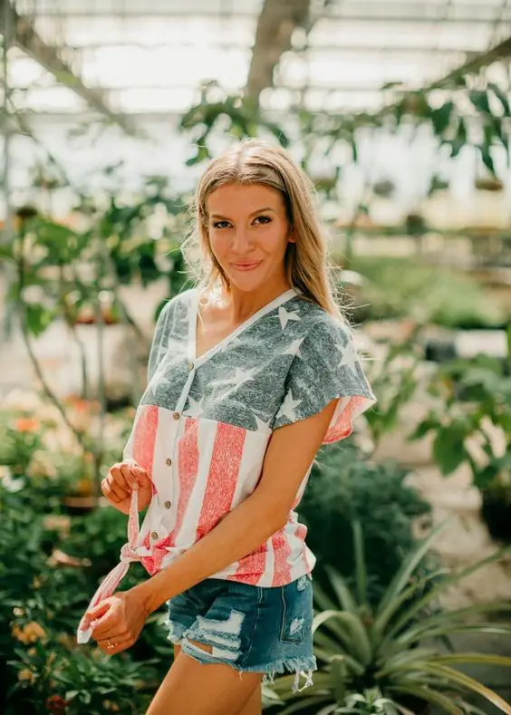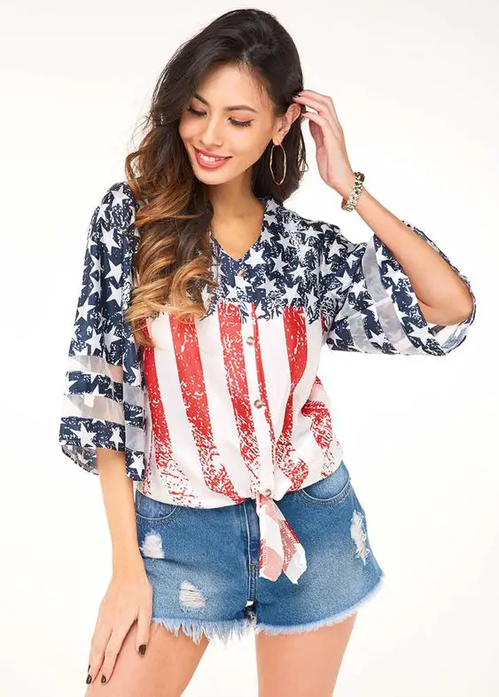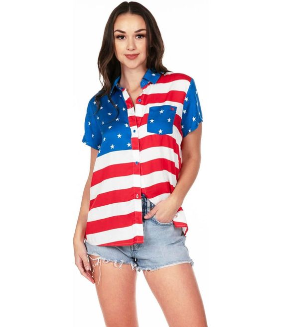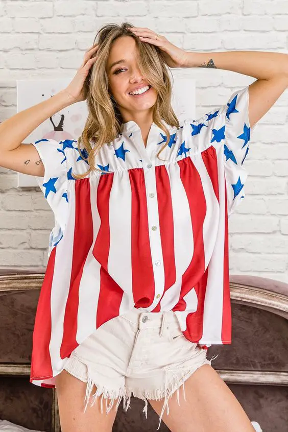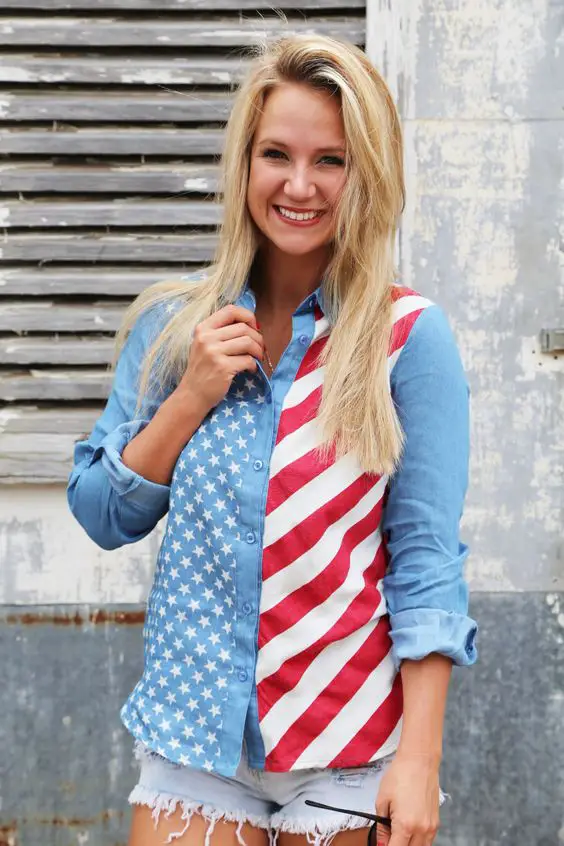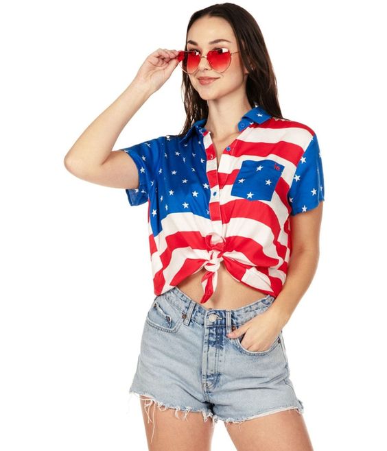 На цьому зображенні класична сорочка на ґудзиках із мотивом американського прапора, зав’язана на талії для невимушеного, кокетливого вигляду. Цей стиль особливо подобається жінкам, оскільки він підкреслює лінію талії та поєднує комфорт із жіночністю.