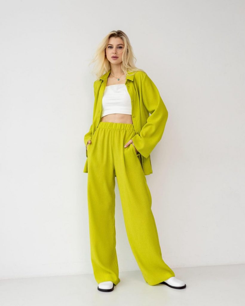 Цей сміливий неоново-зелений костюм додасть живого кольору будь-якому літньому гардеробу. Завдяки своєму невимушеному крою, він забезпечує зручну посадку, створюючи сильний модний образ. Цей ансамбль ідеально підходить для тих, хто любить виділятися в натовпі за допомогою шикарного та стильного літнього вбрання.