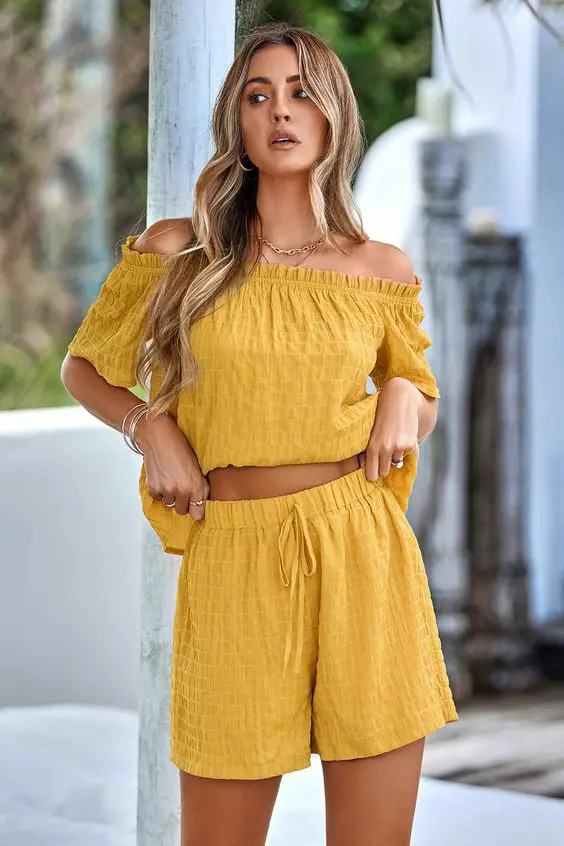 Цей чудовий комплект із двох предметів гірчично-жовтого кольору пропонує новий погляд на літній повсякденний одяг. Текстура тканини додає глибини, а топ із відкритими плечима та шорти в тон створюють грайливий, але невимушений образ. Це ідеальний приклад стильного літнього одягу для повсякденного відпочинку на вихідних або випадкової зустрічі з друзями.