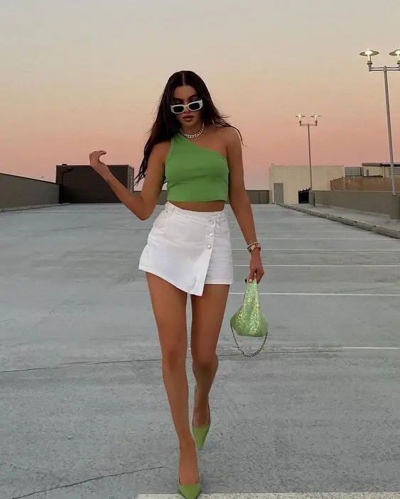 Цей яскравий і молодіжний одяг включає сміливий зелений кроп-топ у поєднанні з білою спідницею з високою талією. Цей ансамбль ідеально підійде для тих, хто любить вливати яскраві кольори у свої стильні літні вбрання.