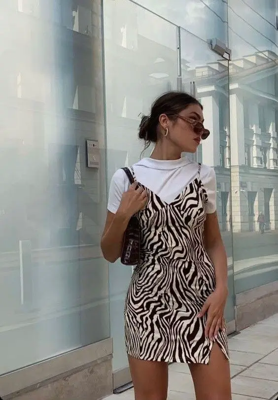 У цьому одязі використовується сміливий принт зебри, щоб створити неперевершений образ, ідеальний для міських джунглів. Багатошаровий ансамбль із сукнею з принтом зебри поверх базової білої футболки демонструє витончений вуличний спосіб одягнути гучний одяг на день.