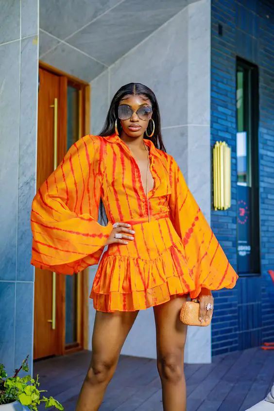 Ця яскрава помаранчева сукня з ефектними деталями на рукавах відтворює літні веселощі та витонченість. Це фантастичний вибір для сміливих заяв на літніх вечірках або звичайних прогулянках.