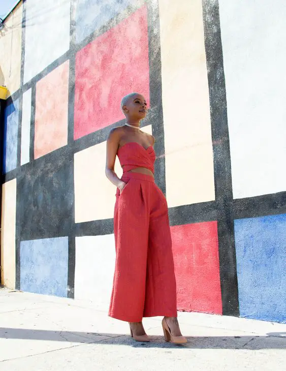 У цьому витонченому ансамблі красивого кольору іржі поєднується топ без бретелей і відповідні штани з високою талією, створюючи гладкий і елегантний образ, ідеальний для офіційних літніх заходів.