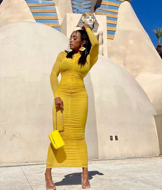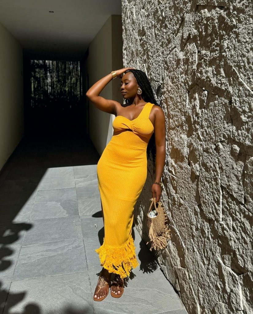 Ця яскрава жовта сукня передає суть літа завдяки своєму яскравому кольорі та грайливій бахромі на подолі. Це ідеальний приклад стильного літнього вбрання для чорношкірих жінок, у якому яскрава естетика поєднується з елегантним дизайном. Сукня витончено облягає фігуру, що робить її підходящою для тих, хто цінує привабливий стиль, який підкреслює природні вигини.